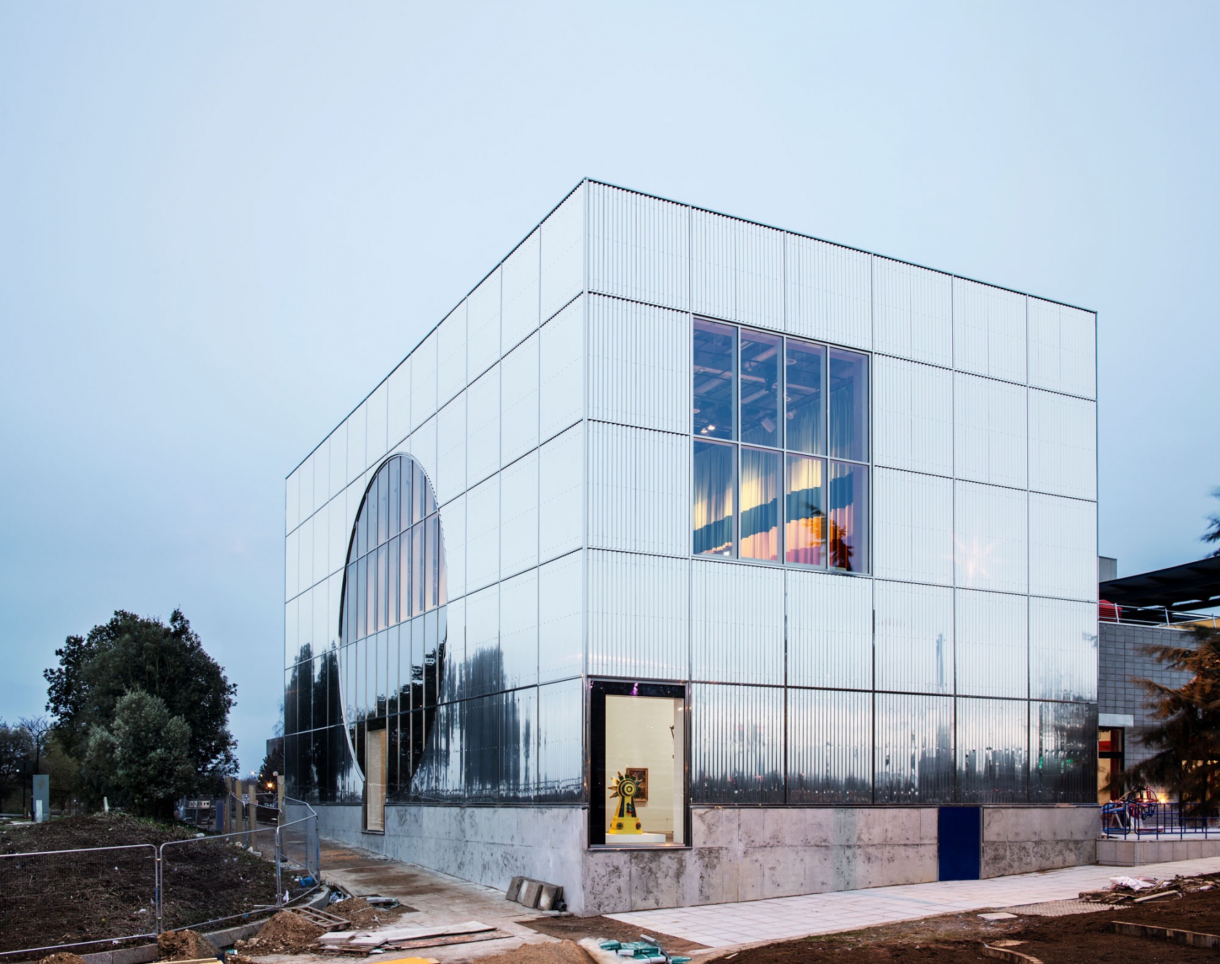 A new wing consisting of a simple rectangular form wrapped in corrugated stainless steel recalls the rigorous grid that underpins the city, once a playground for British modernists and the early pioneers of High-Tech. Its polished facade shifts ambiguously between reflection and opacity, while a circular window frames views over the orbital landforms and belvedere of Campbell Park. The city grid is suggested the walls and the landscape in the window. The gridded rectangle houses an assembly of new gallery spaces and an education studio below an auditorium. The axial arrangement of galleries, with windows aligned on either end, recalls the layout of the city.