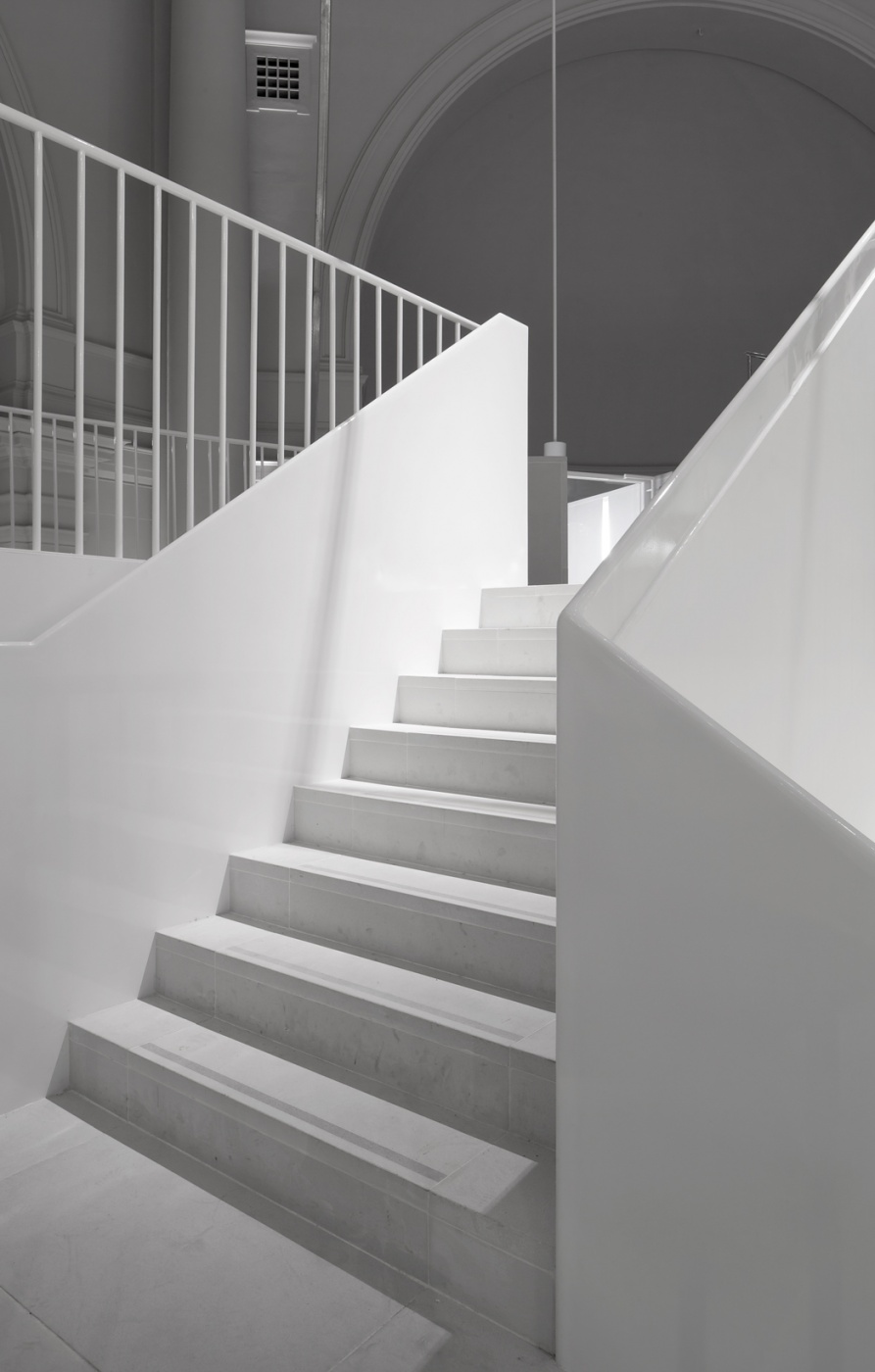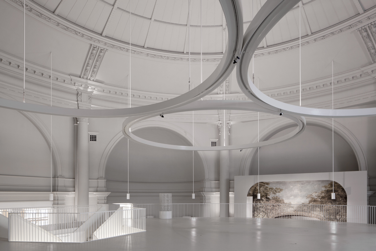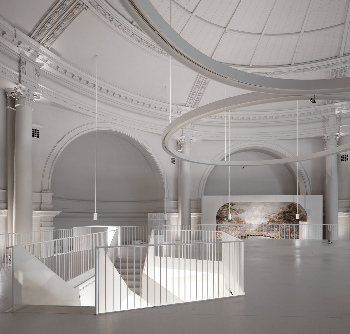 Through a careful process of demolition and stripping back, 6a architects has revealed the quality of Webb’s original architecture. The mosaic floor has been painstakingly restored and the original entrances to the gallery reinstated. The 1960s steel frame mezzanine is also celebrated: cut back and infilled to a pure circular geometry, it is wrapped in a new balustrade of slender white steel, and its stiletto-like columns exposed. Three new circular lighting rings are suspended from the original iron roof truss to provide both ambient and flexible exhibition lighting for temporary exhibitions and a terrazzo cylindrical lift makes the mezzanine fully accessible and completes the orbital architecture.