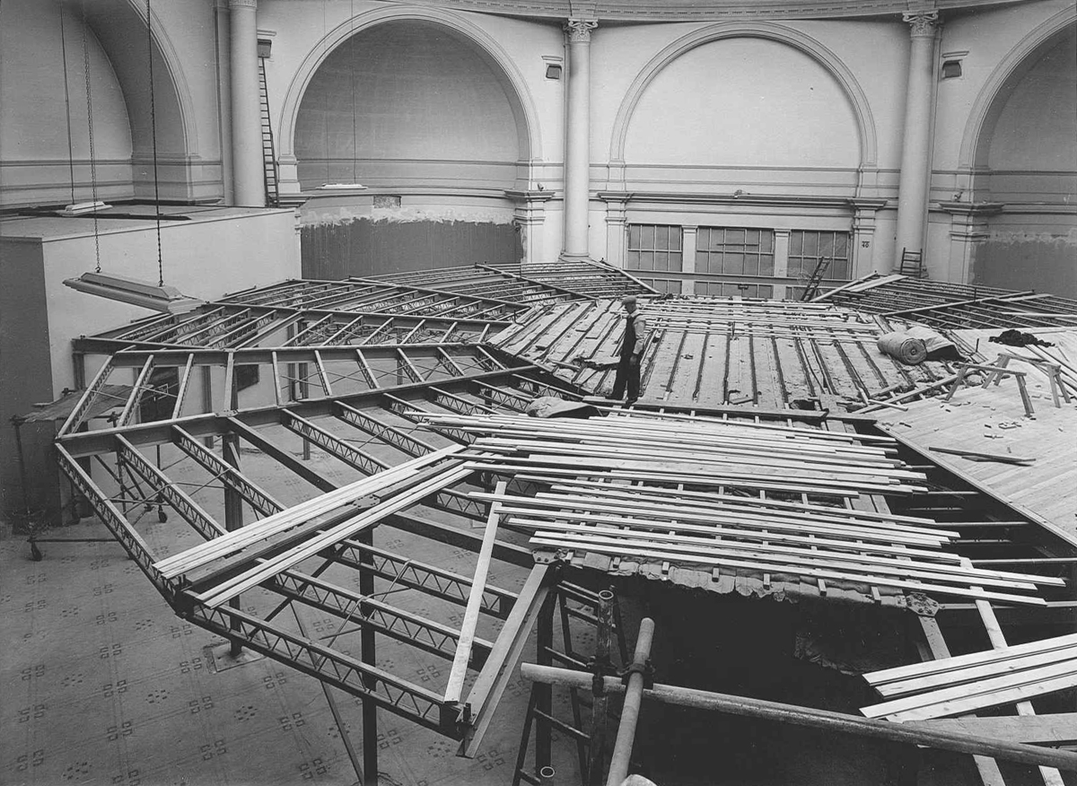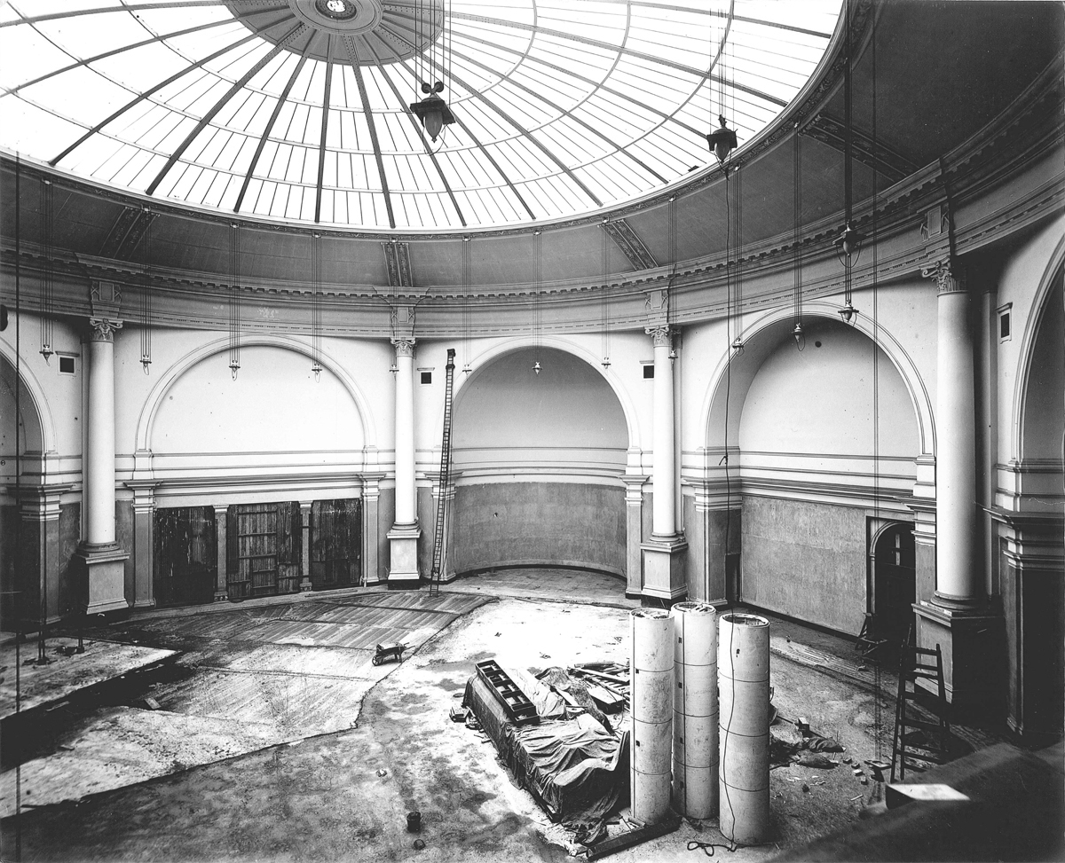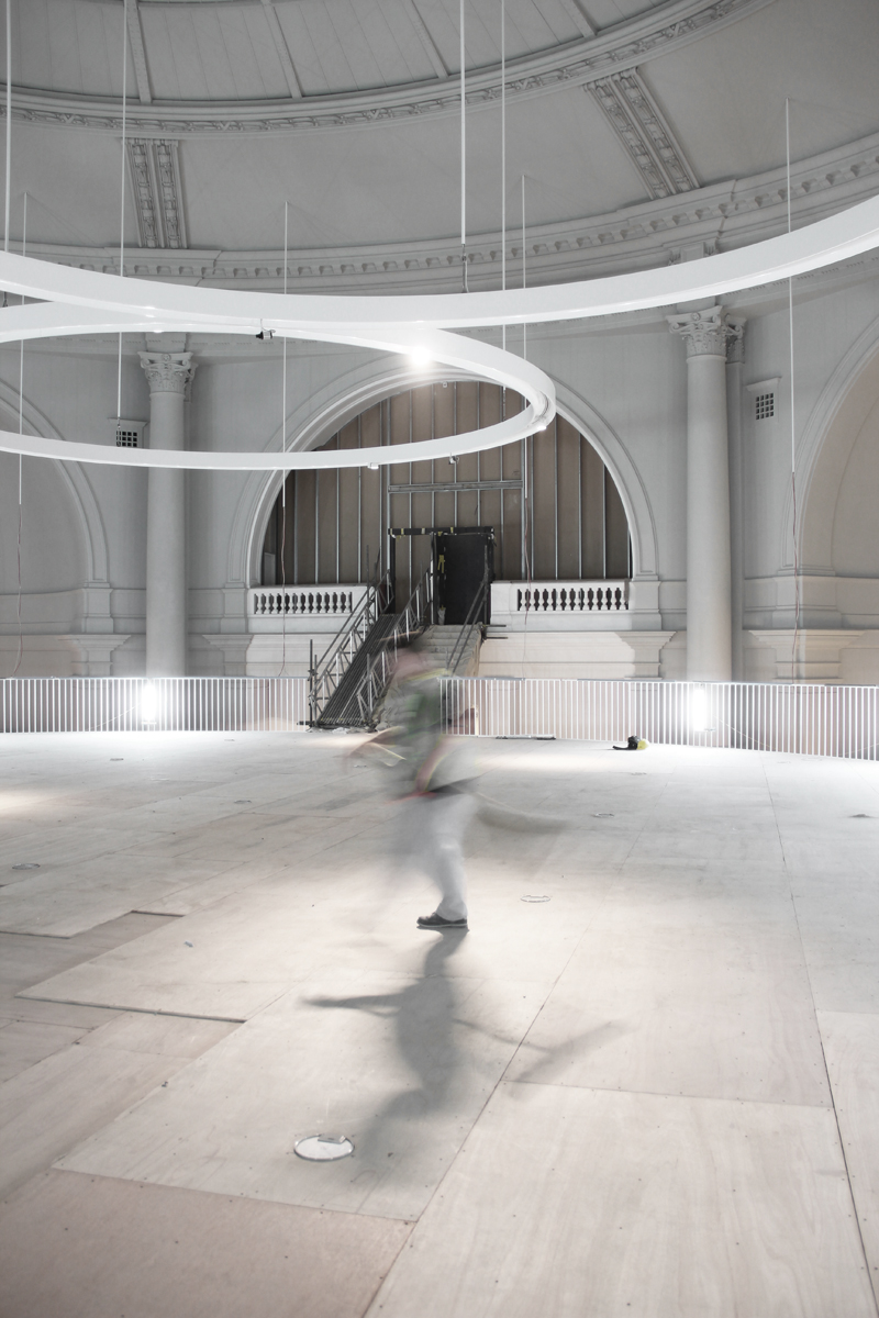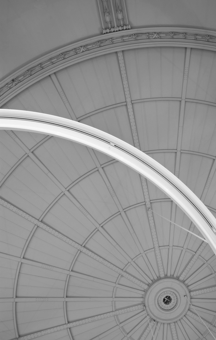 Through a careful process of demolition and stripping back, 6a architects has revealed the quality of Webb’s original architecture. The mosaic floor has been painstakingly restored and the original entrances to the gallery reinstated. The 1960s steel frame mezzanine is also celebrated: cut back and infilled to a pure circular geometry, it is wrapped in a new balustrade of slender white steel, and its stiletto-like columns exposed. Three new circular lighting rings are suspended from the original iron roof truss to provide both ambient and flexible exhibition lighting for temporary exhibitions and a terrazzo cylindrical lift makes the mezzanine fully accessible and completes the orbital architecture.