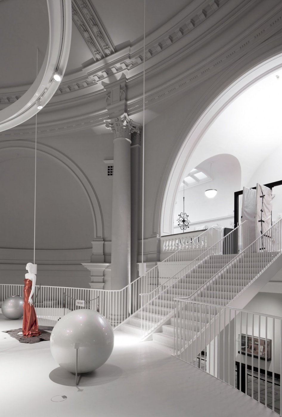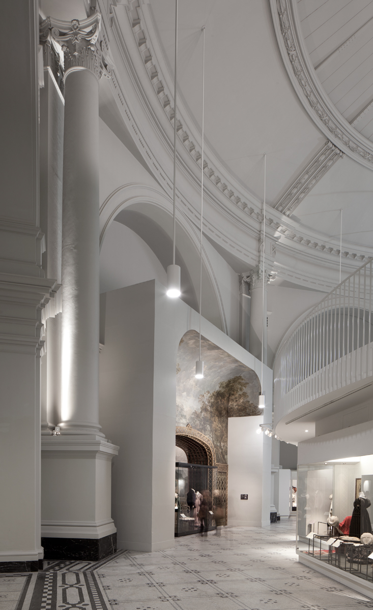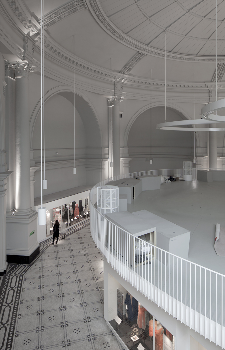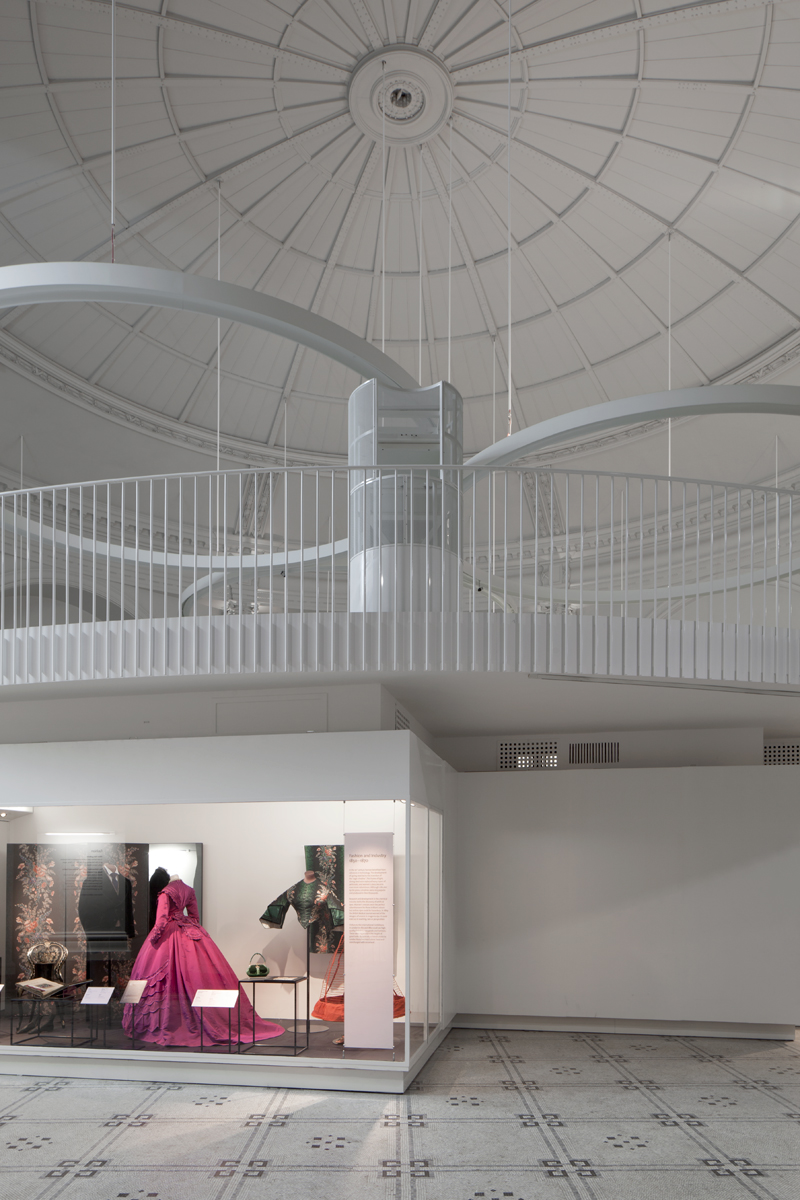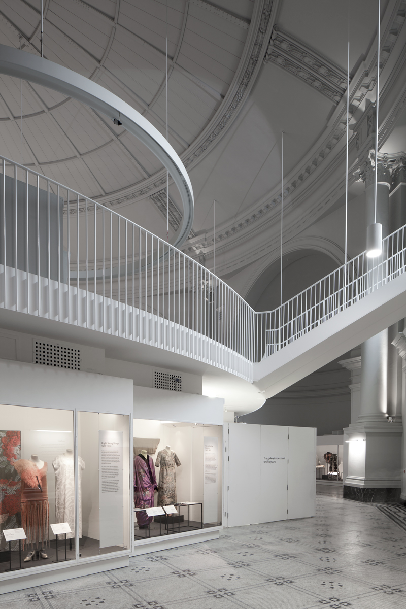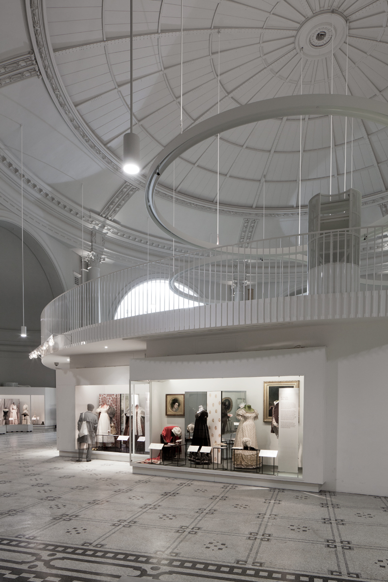 The fashion gallery at the Victoria and Albert Museum reopens on 19th May 2012 following an extensive refurbishment designed by 6a architects. The gallery will house the fashion collection and temporary exhibitions for the next decade. Gallery 40, or the Octagon Court, is one of the largest and most architecturally distinctive interior spaces at the V&A. Built in 1909 by Aston Webb, the Grade I listed gallery is a vast domed space, with deep arched alcoves carved out of its perimeter. In 1962, the gallery was dramatically reconfigured with the insertion of a steel framed mezzanine, and the original mosaic floor covered over.