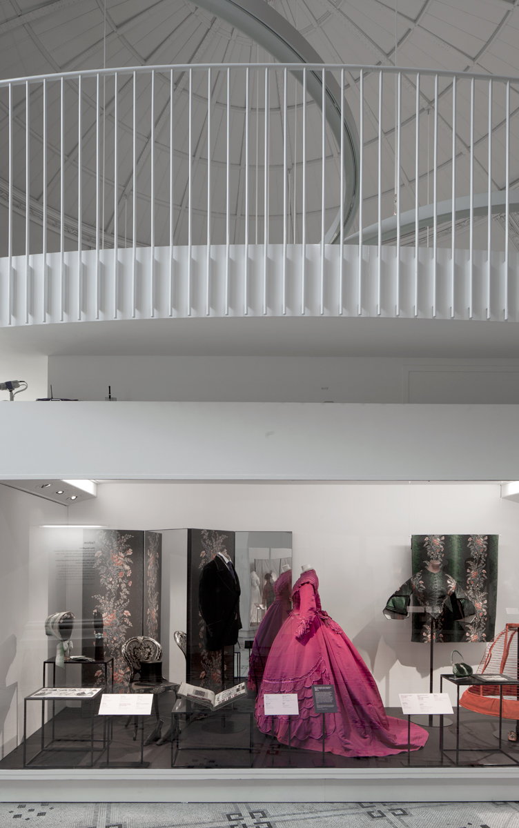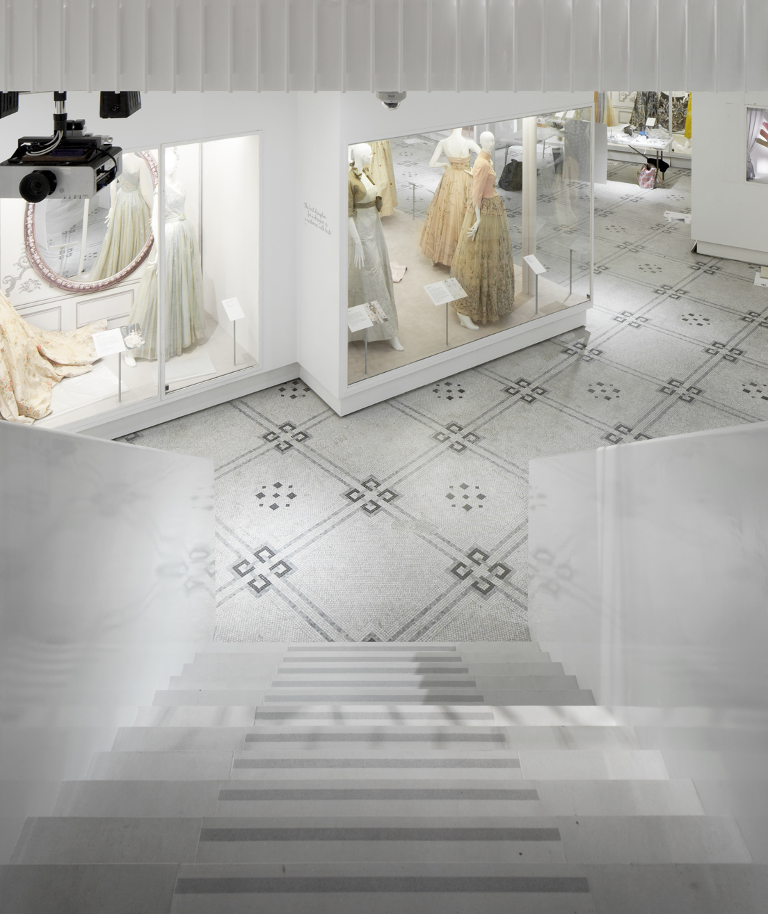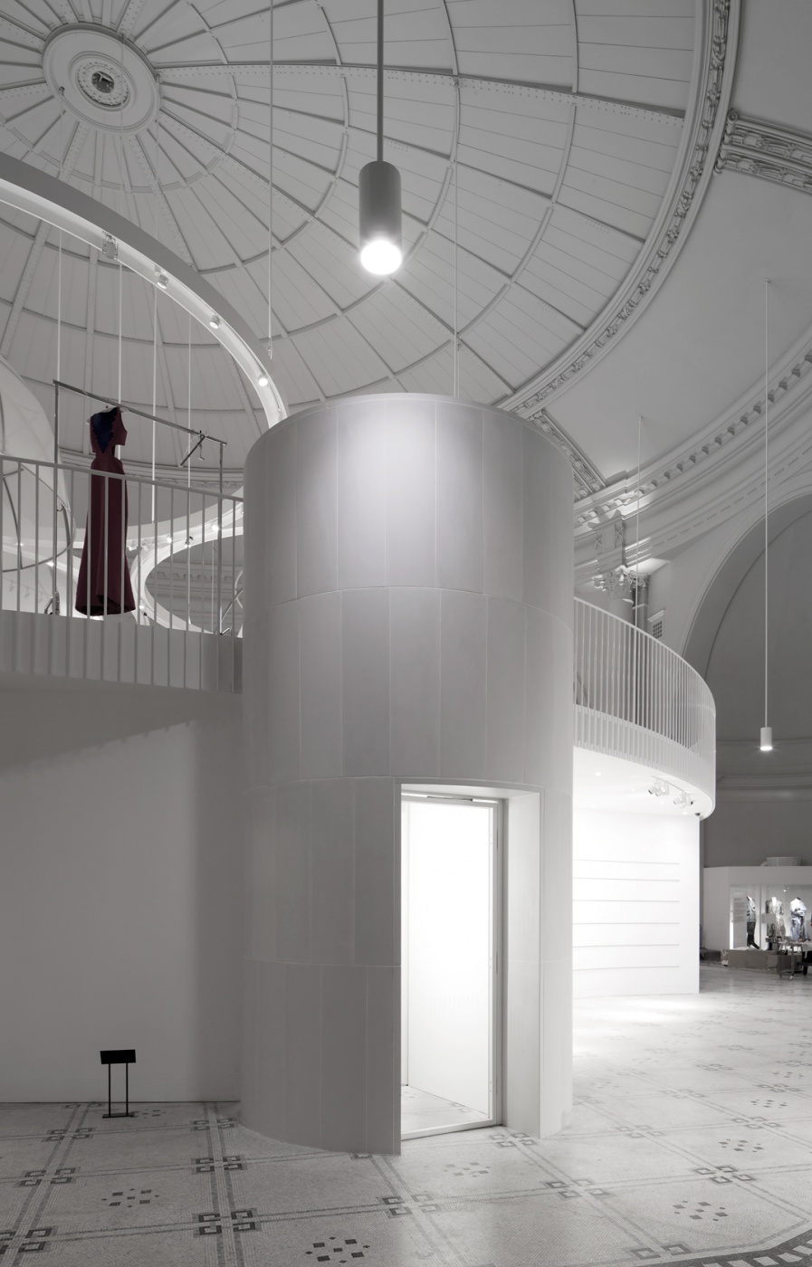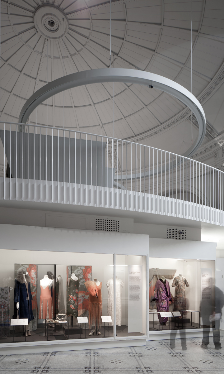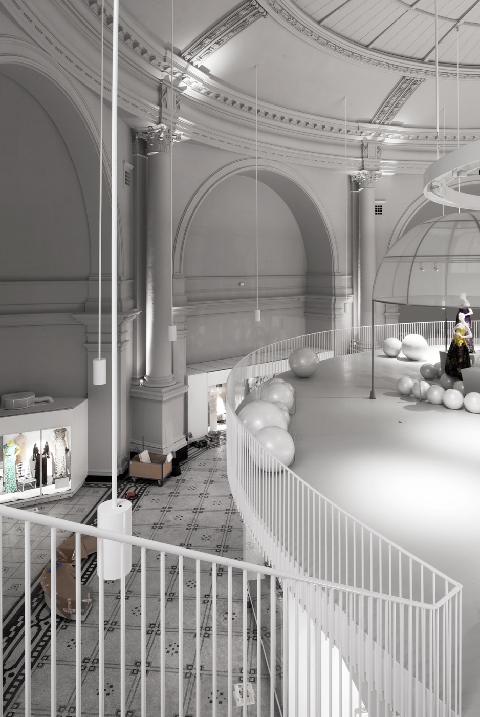 The fashion gallery at the Victoria and Albert Museum reopens on 19th May 2012 following an extensive refurbishment designed by 6a architects. The gallery will house the fashion collection and temporary exhibitions for the next decade. Gallery 40, or the Octagon Court, is one of the largest and most architecturally distinctive interior spaces at the V&A. Built in 1909 by Aston Webb, the Grade I listed gallery is a vast domed space, with deep arched alcoves carved out of its perimeter. In 1962, the gallery was dramatically reconfigured with the insertion of a steel framed mezzanine, and the original mosaic floor covered over.