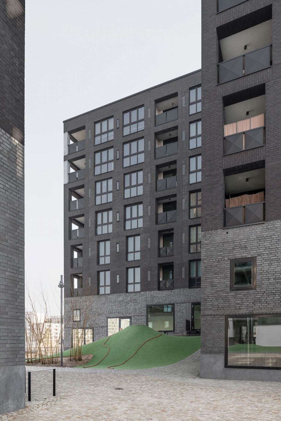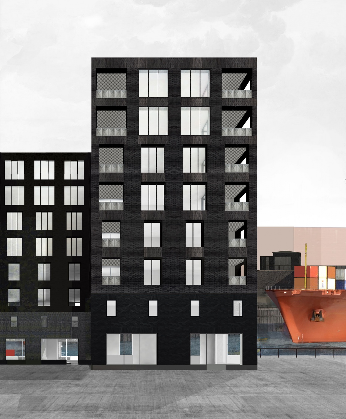 The project starts with a set of parameters defined by the masterplan. With views over the Elbe River, the towers stand on an already layered waterfront comprising the harbour, a civic pedestrianised base, a mixed-use level and social housing. Invoking London’s predominantly upright architecture, they are designed with a restraint that manifests itself in the design’s overall vertical qualities. Each tower – one rectangular, the other z-shaped – house 84 apartments in total. Loggias are built into the internal floorplan to avoid external attachments and to protect occupants from the harbour’s blustery exposure. Only the proportion of the fenestration varies, increasing with the height of the building, as the measured privacy at ground level gives way to the open panorama. A palette of varied bricks makes up a facade designed to weather the harsh North Sea elements. Cast iron, a native of waterfront architecture and infrastructure, provides occasional details – pragmatically, as drain covers and protective skirtings, and as decorative and civic ornamentation, punctuating an entrance, a street lamp or balustrade.