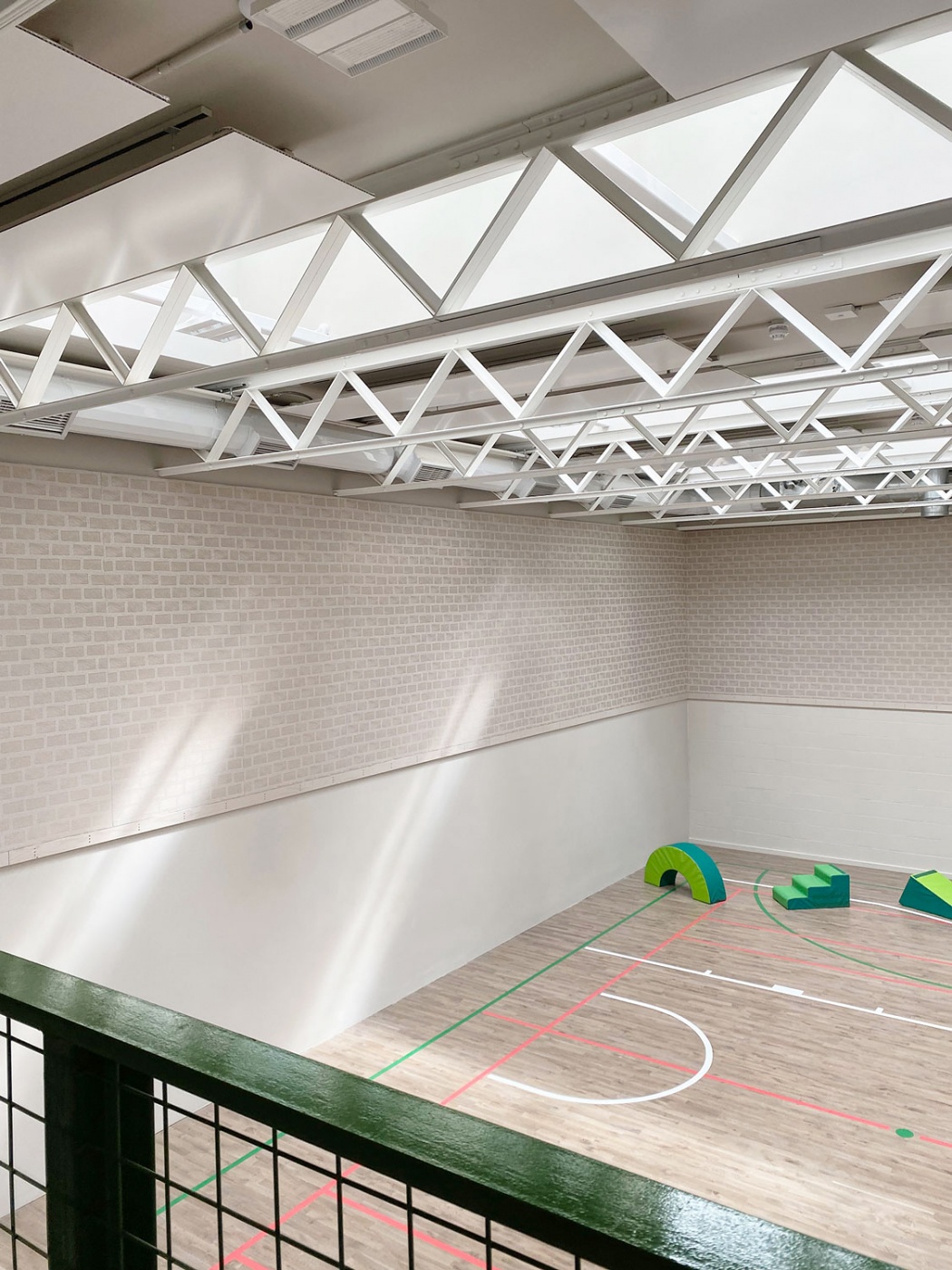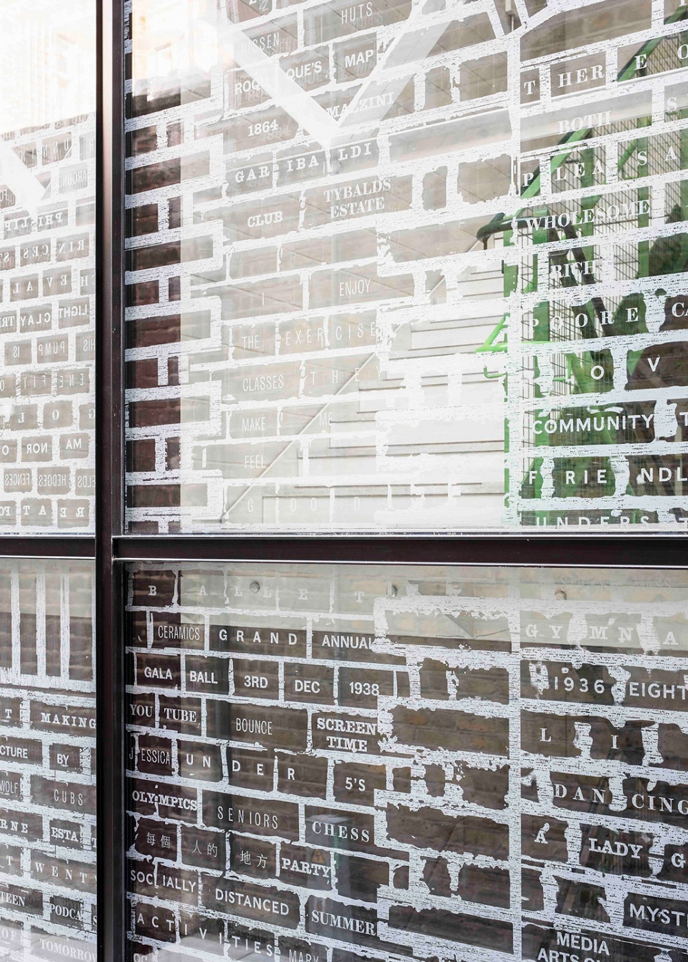 The gym is insulated and acoustically relined with Thurings handwoven panels. A new lightweight roof has sky views. Two new floors offer sunlight, transparency and connected spaces, welcoming and safe. White painted steel trusses unfold from the new entrance introducing views deep into the block, The new public artwork is integral to the architecture, it brings the rich history of Holborn’s community back into the public realm. Materials are simple and direct, attention paid to detail and finish. Construction is legible in exposed timber joists, stacked on steels, resting on blockwork. Proprietary bathroom tiling is transformed with Thurings gridded patterns and colour, the brightly coloured mesh balustrades reference Holborns origins of forest. The curtain wall glazing of the façade is transformed by the local stories, names, events and places inscribed across it in etched mortar lines, traced from multiple eras of the surrounding brickwork. The new studios, changing rooms, workspace and clubrooms can engage new audiences. Each space is designed equally for hire to grow HCA greater financial independence.