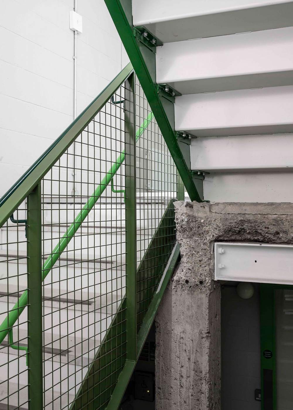 Re-use is core to the project, the old concrete infrastructure of basement and ground slabs, columns and sheer brick walls were retained, stripped back and the new design in/onto them, An area of the existing concrete ground slab was cut to insert an entrance ramp, and a new lift was inserted into the structure to make all of its floors fully accessible. A New ASHP system provides heating and cooling but the building can be passively ventilated throughout.